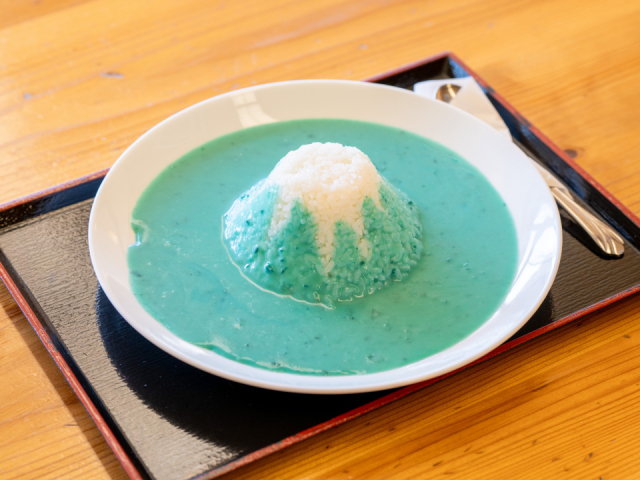 お目当の「青い富士山カレー」が食べたかったから!ご飯がちゃんと富士山の形をしていて、そしてものすごく青いです。これは映える!目の覚めるようなブルーなカレーなので、味の方もさぞかし爽やかなんだろうと思いつつ食べてみたら、見た目に反して意外とスパイシー!そしてクリーミーでコクのある味で美味しかったです♪