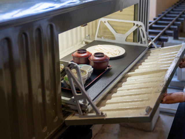 お部屋の前でSLが止まったら、自分たちでSLを開いて料理を取り出します。山梨県の名物といえば、ほうとう!ということで、本日はほうとう鍋を頼みました。