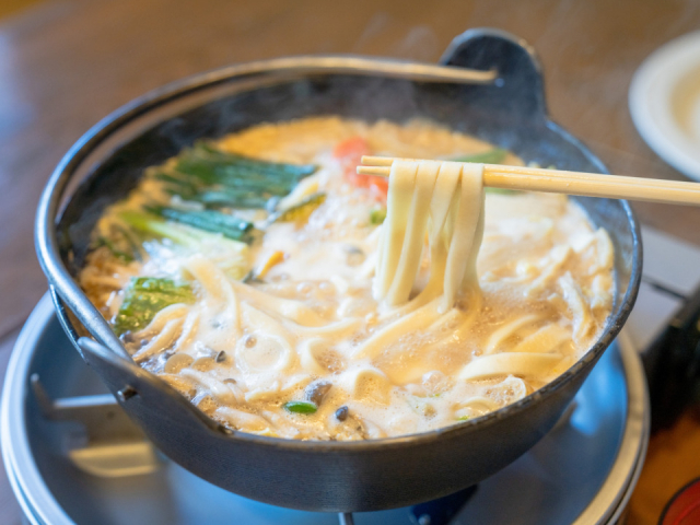 きのこに季節の野菜、にんじん、かぼちゃがゴロゴロ入っています。これらの旨味が、鰹といりこ、赤白味噌がブレンドされた出汁に溶け出し、なんとも滋味溢れる美味しさです。ほうとう独特の平たい麺も、出汁がよく絡んで美味しい!ほどよく溶けたかぼちゃもたまりません。