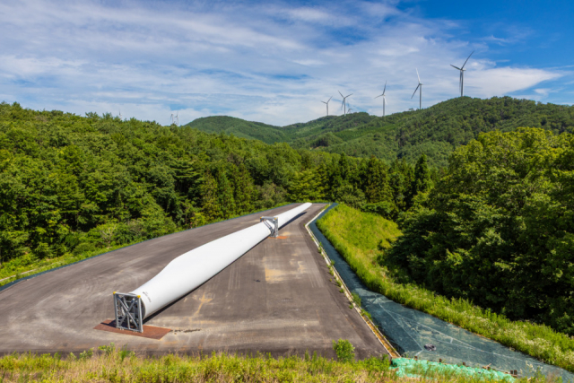 また、敷地内には50メートルを超える巨大な予備のブレード(羽根)が保管されています。