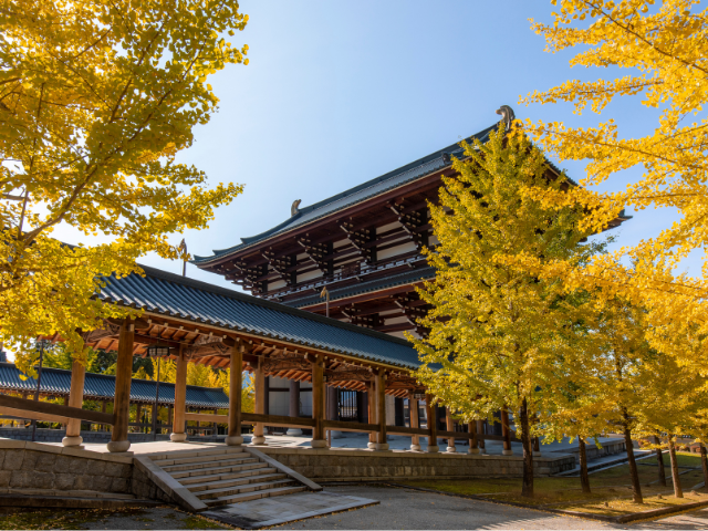 広大な境内では、コケとモミジの木々が織りなす紅葉風景が広がるほか、イチョウの葉が黄色く色づいた黄葉風景が楽しめます。五重塔の上部から一望できる、境内の紅葉と周囲の田畑が黄色く染まった秋の光景もみごとです。