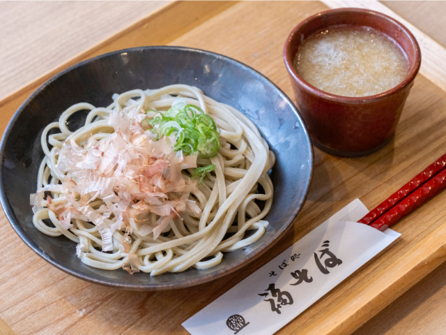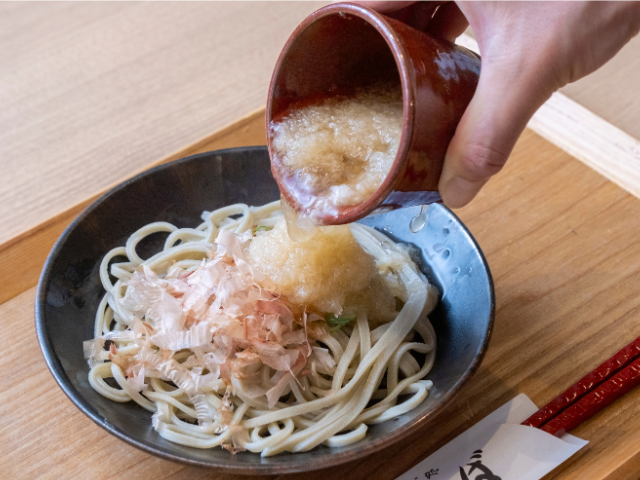 削り節とネギをのせたそばに、大根おろし入りのつゆをかける「おろしそば」