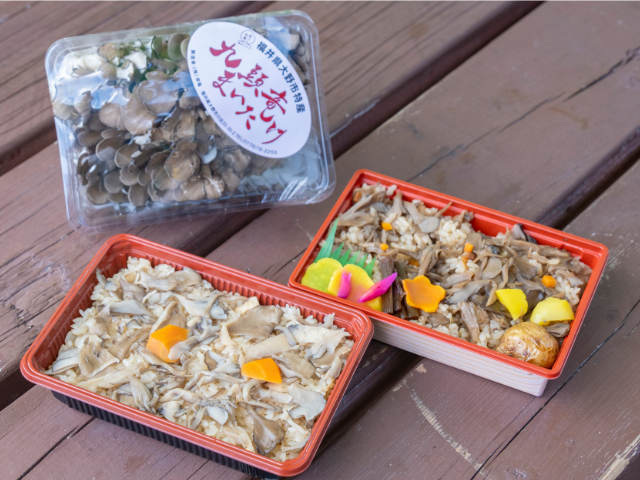 同じく九頭竜まいたけを満喫できる料理があるのは、九頭竜湖の西端に位置する「道の駅 九頭竜」。テイクアウト販売のみですが、まいたけ弁当が人気を集めています。