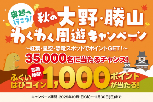 10月1日(水)より、大野市&勝山市を訪れた旅行者に、スマートフォン等を使った即時抽選で、デジタル地域通貨「ふくいはぴコイン」1,000ポイントがその場であたる「奥越へ行こう!秋の大野・勝山わくわく周遊キャンペーン」を実施します。