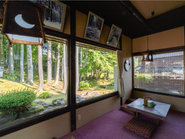 コケ庭が目の前に広がる囲炉裏のある店内