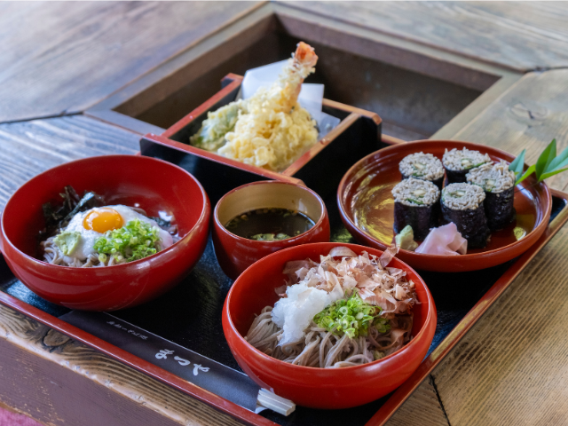 おろしそば、やまかけそば、そば寿司、天ぷらが付く「そばづくし」3000円