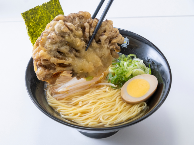 ひとつ目のおすすめ料理が、「道の駅 越前おおの 荒島の郷」のフードコート内の1軒、荒島テラスが提供している「九頭竜まいたけラーメン」と「うまいたけ餃子」。ラーメンには薄衣の大きなまいたけの天ぷらがのっていて、九頭竜まいたけを満喫できます。刻んだまいたけが入った餃子は、数量限定中という人気メニューです。