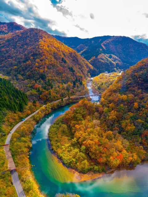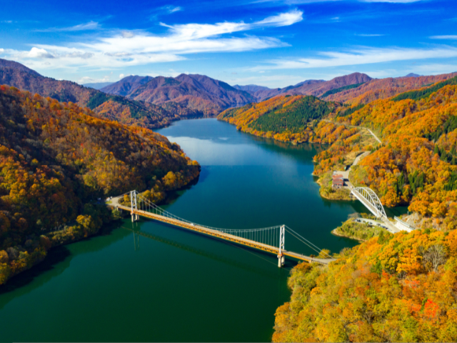 九頭竜湖の東側にかかる夢のかけはし(箱ヶ瀬橋)と紅葉風景