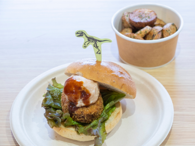 なかでも「道の駅 恐竜渓谷かつやま」のカフェレストランでは、奥越産の里芋をたっぷりと使ったコロッケや明太子入りの里芋のペーストなどをサンドした、ご当地バーガーがおすすめです。