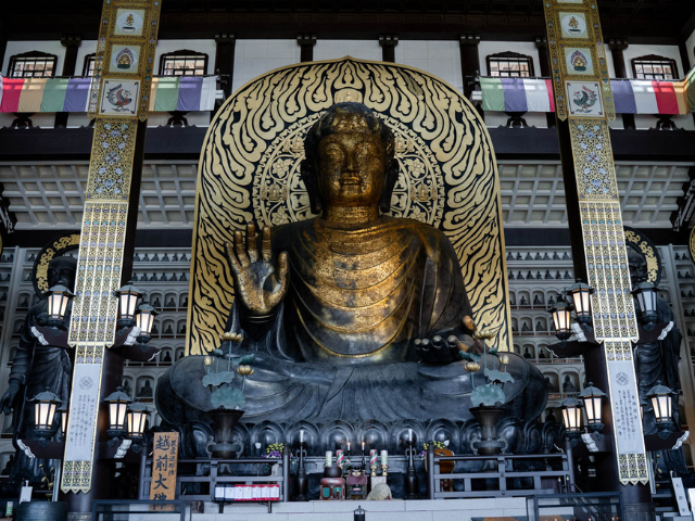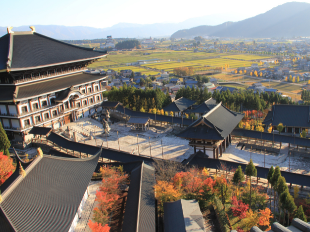九頭竜川をさらに北へ進んだ先の勝山市内にも、おすすめの秋の絶景を見つけました。奈良の大仏を上回る大仏本尊(通称・越前大仏)がシンボルとなっている、臨済宗の寺院・清大寺です。石仏・金仏をあわせて1281体が安置された大仏の左右と後方の壁も、神秘的な空気に包まれていて必見です。