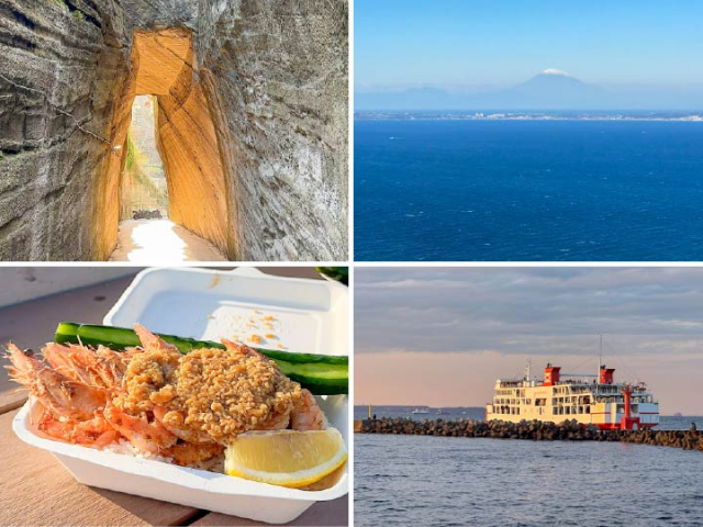 (左上)燈籠坂大師の切通しトンネル(左下)ゴールデンシュリンプ(右上)鋸山ロープウェーからの景色(右下)東京湾フェリー金谷港