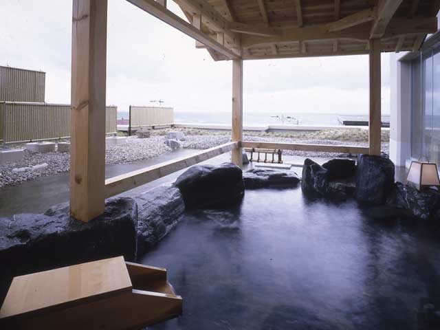 大浴場は田舎家風の造り。貸切展望露天風呂も好評