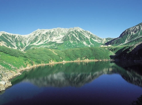 約1万年前の噴火によってできた火口湖。周囲630m、水深は15mで、池の向こうに雄山、大汝山、富士ノ折立の立山三山がそびえるアルペンルート随一の絶景スポットとして知られている。