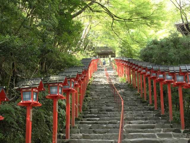 平安京遷都の翌年(795年)に桓武天皇の命により、皇居鎮護の神として創建。宗像三女神を主祭神とする。3~4月はさまざまな桜が咲き満ちる。秋は紅葉、12~翌2月は水仙も美しい。