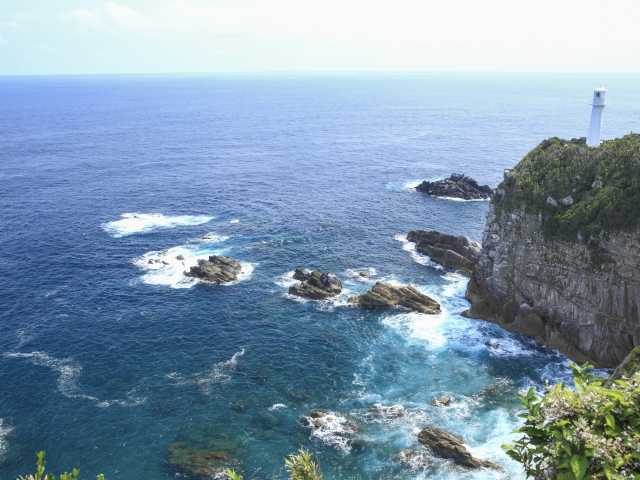 亜熱帯植物が生い茂る愛媛県最南端の岬。高さ100mを超える入り組んだ断崖が続き、晴れた日には九州が見えることもある。夕暮れどきはとくに美しい。