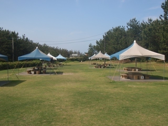 ショートゴルフなど、体を動かせる設備が整った海浜公園。バーベキュー場は、気持ちのよい松林の中に大型の常設炉を25基設置。12名程度座れるベンチも付属しているので、大家族や小グループでもゆったりとバーベキューを楽しめる。食材は持参してもいいが、肉や野菜のケータリングもしてくれるのでぜひ利用してみたい。