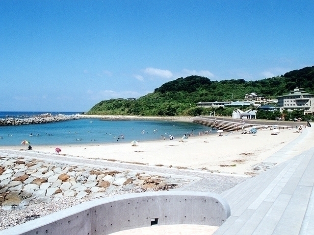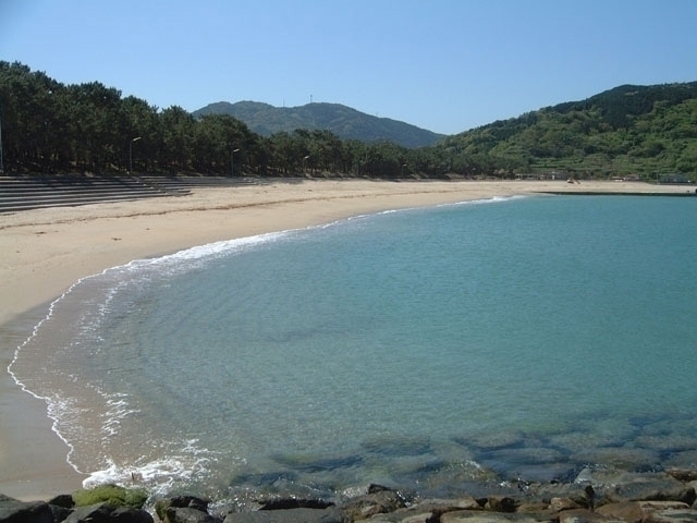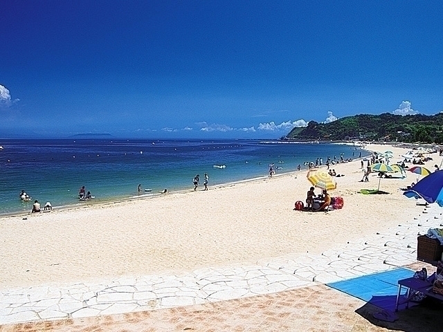 天草灘に面した富岡半島の付け根部分に位置する海水浴場。コバルトブルーの海は波が穏やかなので、小さな子どもも安心だ。水質が大変よく「快水浴場百選」にも選定された。また、海中では熱帯系の魚類が見られる。近くには白岩崎キャンプ場があり、1年を通じてキャンパーでにぎわう。