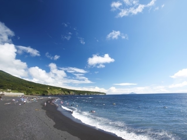 元町港からほど近く、更衣室やシャワー室(遊泳場指定期間のみ)があり、夏には海の家がオープンする人気のビーチ。近くには町営のプールも開設するため小さい子どもも安心だ。大島の中央にそびえる三原山から、玄武岩質の火山砂や火山灰が沢を伝わり供給され、形成される黒い砂浜が伊豆大島の海岸の特徴となっている。