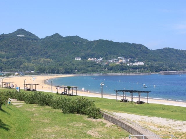 串本から紀伊大島に向かい連なる奇岩が印象的な名勝・橋杭岩や紀伊大島、くしもと大橋を望む海水浴場。白い砂浜が美しい遠浅の海は水質も良好で、「快水浴場百選」に選定されている。シャワー室、休憩所、食堂、ロッカーなども完備され快適な海水浴が楽しめる。