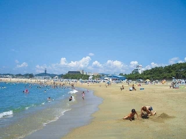 扇ヶ浜公園に隣接する海水浴場。扇形をしていることから扇ヶ浜と呼ばれる浜の海水浴場で、ビーチハウスにはトイレ、更衣室、無料シャワー、有料温水シャワー、無料ロッカーも完備。水質も良好で、期間中にはさまざまなイベントが行われる。(ビーチハウスの開設については要問合せ)