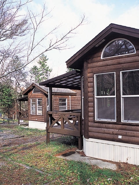 高い木々に囲まれた林間のサイトは居心地がよく、宿泊施設にはログキャビンやトレーラーハウスがある。場内には風呂もあり、サニタリー施設も充実し、清潔。子どもには川遊びが人気だ。