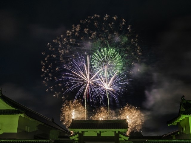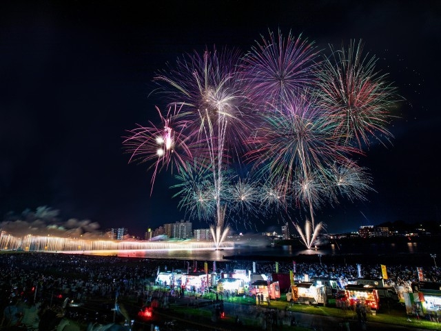 世界遺産に登録された熊野古道ルートに位置する新宮市。徐福とは今から2200年ほど前、秦の始皇帝の命を受け不老不死の霊薬を求めて熊野に渡来したと伝えられている人物だ。初日は徐福公園で徐福の供養式典が行われ、2日目は熊野川河川敷にて花火大会が行われる。同時早打ちや仕掛花火など趣向を凝らした数々の花火のほか、水面から半円を描いて打上がる水上スターマイン、雄大な熊野川などにかかるナイアガラなどが、新熊野大橋付近から打上げられる。間近で花開く約6000発の花火は迫力満点だ。
