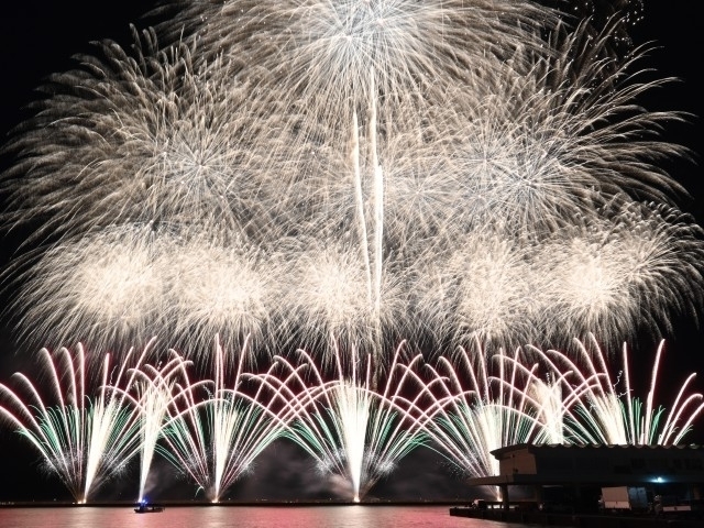 幻想的なとうろうが海上を、花火が夜空を美しく彩る