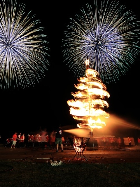 「スーパー大火勢(おおがせ)」は高さ20m、重さ1t、木の葉型の大松明に火をつけ、炎を上げて燃えているところを約50名もの若者が勢いよく回転させて、炎の勢いが衰え始めたころ海へ倒す、という勇壮な火祭り。花火大会はこの「スーパー大火勢」終了とタイミングを合わせて開始。とにかく間近で見られるのと、約30分間ノンストップで打上げられるため、かなりの迫力が感じられる。力強い太鼓の演奏など、多彩なイベントも開催される。