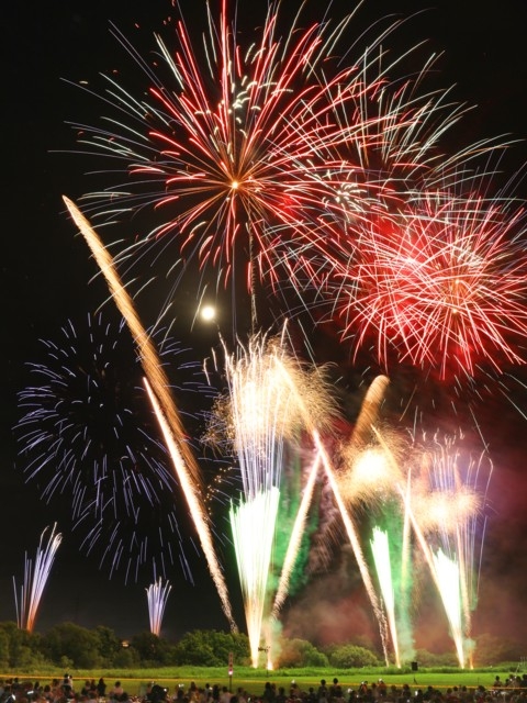 1986(昭和61)年から始まった「手取の火まつり(川北まつり)」。まつりのクライマックスを飾る花火大会は4部構成で、2万発の打上げは北陸最大級の規模だ。スターマイン5基の連続打上げ、スクランブルスターマイン(斜め打ち)などで夜空は極彩色に染め上げられる。様々な種類の協賛者観覧席(いす席、テーブル席、芝生シート席など)も用意されているので事前申し込みがおすすめ。
