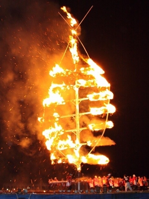 「スーパー大火勢(おおがせ)」は高さ20m、重さ1t、木の葉型の大松明に火をつけ、炎を上げて燃えているところを約50名もの若者が勢いよく回転させて、炎の勢いが衰え始めたころ海へ倒す、という勇壮な火祭り。花火大会はこの「スーパー大火勢」終了とタイミングを合わせて開始。とにかく間近で見られるのと、約30分間ノンストップで打上げられるため、かなりの迫力が感じられる。力強い太鼓の演奏など、多彩なイベントも開催される。