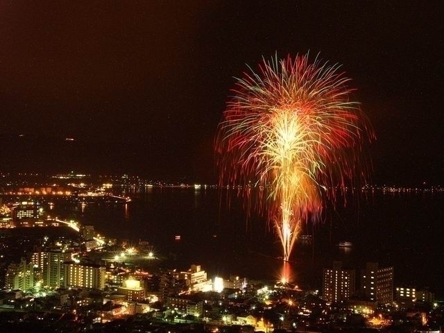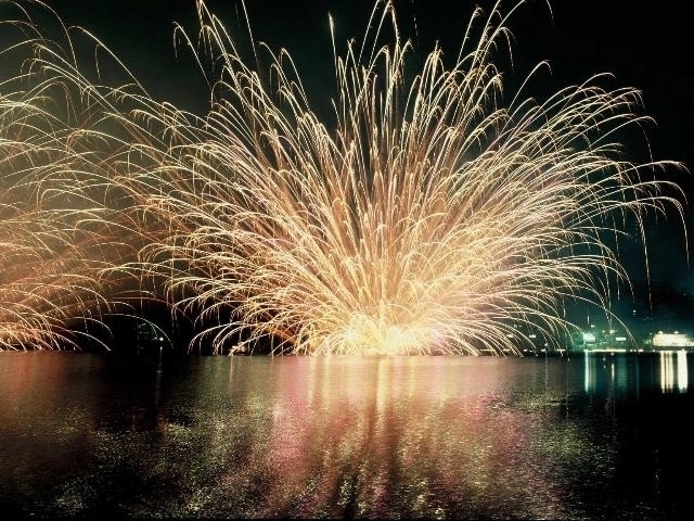 1949(昭和24)年、終戦後の混乱が続くなか、市民が明るい希望を持ち一日も早く立ち直ることを願って始められた花火大会。信州はもちろん、全国でも屈指の規模を誇っている。この大会の見どころは、諏訪湖ならではの轟きと煌めき。特に水上スターマインは水面ぎりぎりで披露されるため水上に半円の花が咲いたようになる。湖面が鏡の役割をし、映し出された半円の花火とつながり、まるで一つの円のように見える。