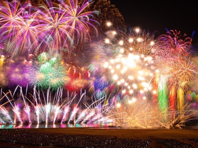 新潟市から車で1時間ほどの長岡市寺泊の砂浜で開かれる花火大会。尺玉はほとんど単発で打上げられ、一つ一つの美しさが強調される。海中スターマインなどが織り込まれるものの、全体的に風情漂う花火が見られる。さらに、ラストは圧巻。超豪華な海中スターマイン、ベスビアスなど色鮮やかな花火が海面を次々に彩っていく。大音響とともに打上がる巨大な花火が印象的だ。