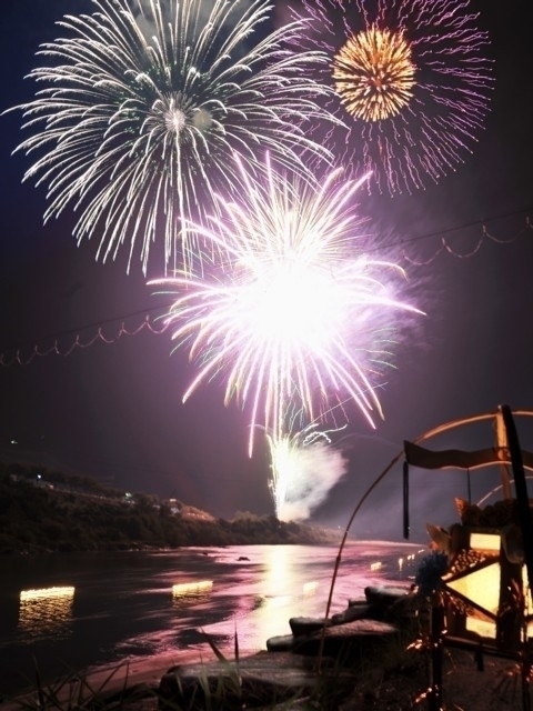 高原の湖にゆらめく無数の灯籠と夜空の花火