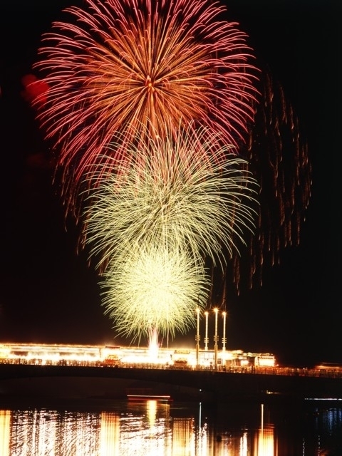新潟県の景勝地、阿賀野川のほとりにある咲花温泉は湯の花が噴出していたことから名付けられたといわれ、湯量豊富で素肌美人の湯としても有名だ。ここで開催される花火大会は、水面で半月状に開く花火が特徴。咲花きなせ堤特別観覧席(有料)では、迫力ある花火を間近で堪能できる。