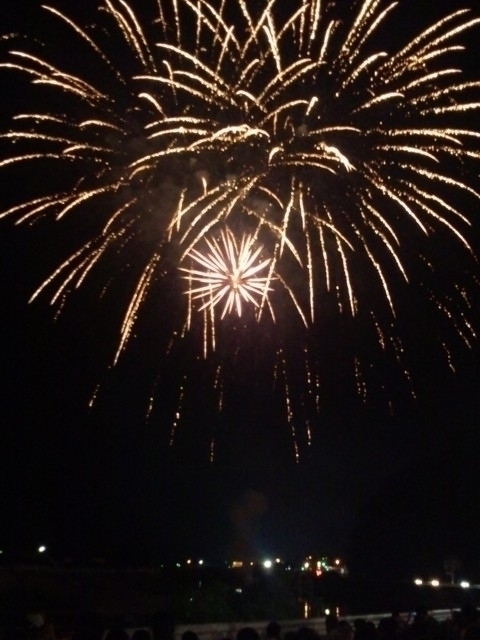 笠岡諸島をバックに華麗に輝く大玉花火は圧巻