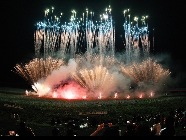 日本最大の湖、琵琶湖を舞台に繰り広げられる大花火大会。今年も約1万発の花火が湖面を色鮮やかに彩る。湖上から次々と打上げられる花火は印象的でロマンチック。そして、さまざまな形の花火が競演する様は、迫力満点だ。湖と夜空を舞台に、華やかで多彩な花火の宴が繰り広げられ、息をつく暇もなく圧倒されてしまう。湖上遊覧と併せて楽しむ人も多く、例年はおよそ30~35万人もの人が集まる。