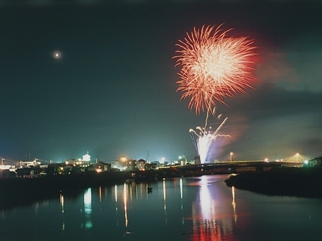 まつりでにぎわう街並みを色鮮やかに染めて花開く花火