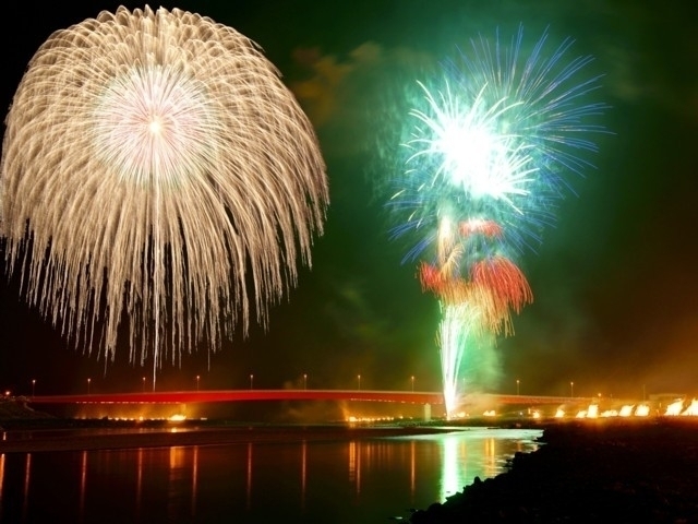 例年8月7日(花火の日)に行われている花火大会で、もともとは神明社の祭典に「神明の花火」として打上げられたのが起源。江戸時代には日本三大花火のひとつとされた由緒ある花火大会で、一時中断していたが1989(平成元)年に復活。今年は地元市川三郷町の町制施行20周年を祝う節目の大会で、スケールは県下最大規模。花火はストーリー性のあるプログラム構成が特徴だ。テーマファイヤー・グランドフィナーレでは夜空一面に鮮やかな華が次々と咲き、まるで花火に包まれているような感覚を味わえる。