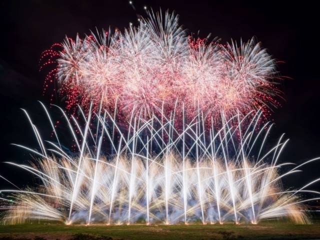 梅雨明けの時期に開催される「笛吹川県下納涼花火大会」。万力公園前の笛吹川河畔から約5000発の花火を打上げ、夏の夜空を彩る。複数の花火を組み合わせて連続的に打上がるスターマインの鮮やかさは観客を魅了。打上げ場所と観覧席が近いため、息をのむほどの迫力が体感できる。打上げ前には飛び込み参加歓迎の納涼盆踊り大会も開催予定だ。