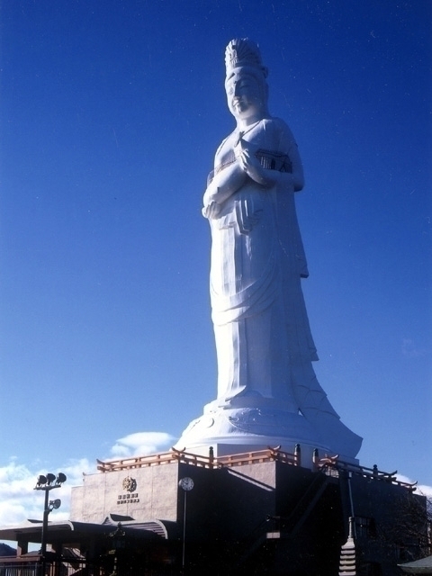釜石湾を行き交う船を見守るように佇む釜石大観音。両手に魚を抱いたところに海抜120mの展望台があり、初日の出が見られるビューポイントとして人気が高く、毎年大勢の人でにぎわう。観音像の胎内には七福神が安置されていて、正月元日から7日までの間に七福神を巡拝して開運を祈る七福神詣ができる。