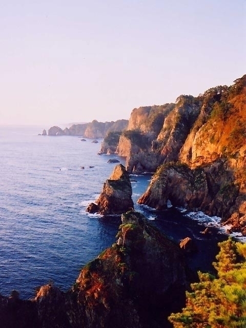 約200mの断崖が8kmにわたって続き、その雄大さから「海のアルプス」と称される北山崎。水平線から昇る初日の出は、神々しい光を放ちながら海面を徐々にオレンジ色に染め上げていき、眺める者の心を魅了する。初日の出の人気スポットで大勢の人でにぎわう。