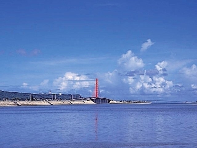 与勝半島のうるま市与那城屋慶名と平安座島を結ぶ全長約4.7km、海の彼方に続くように延びる海中道路。海の上を走るドライブコースの中ほどのロードパークや、赤いアーチ型が美しい伊計大橋から眺める初日の出は絶景。