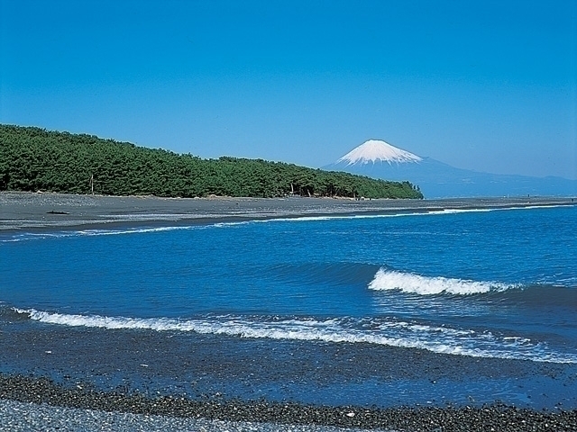 万葉の昔から白砂青松と霊峰富士の眺望の素晴らしさで知られる三保松原は、「日本新三景」「国指定名勝」「日本三大松原」、そして「世界文化遺産富士山」の構成資産にもなっている。伊豆半島から昇る朝日が駿河湾にサンロードを作り、富士山と松原を染めていく光景が美しい。