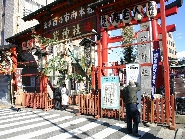 御祭神は天日鷲命(あめのひわしのみこと)と日本武尊(やまとたけるのみこと)。諸国の土地を開き、開運・商売繁盛の神として御神徳の高い天日鷲命がこの地にお祀りされた。そして後に、日本武尊がここで戦勝を祈願し、願が叶ったお礼参りの際、松の木に武具の熊手をかけたのが酉の市の始まり。毎年11月の酉の日に開かれる酉の市で授与される「かっこめ」は商売繁昌のご利益があるとして人気がある。境内に並ぶ屋台も楽しみだ。初詣は「浅草名所七福神詣で」や「東京下町八福神参り」で東京下町を巡ってみよう。