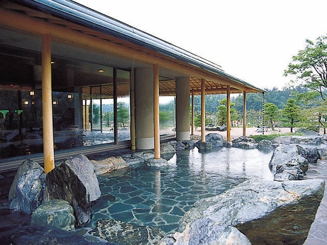 自家源泉と共同源泉を利用した趣が異なる三つの浴場があり、日帰り利用は男性が1か所、女性が2か所。檜の露天風呂をはじめ、桶風呂や五右衛門風呂など18種のバラエティに富んだ湯が楽しめる。