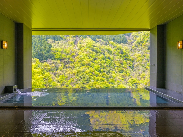 山々の幽玄美と見事な庭園に包まれた景観は隠れ宿のような趣。「滝の湯」「松の湯」と名付けられた浴場は、浴槽だけでなく景色も異なり、それぞれの名称をテーマとした情緒たっぷりのしつらいが魅力。