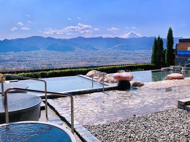 山梨が誇る「温泉」と「フルーツ」を融合させた新しいジャンルの日帰り温泉。露天風呂には宝石風呂や薬石「麦飯石」風呂などがあり、富士山や新日本三大夜景に認定された「笛吹川フルーツ公園」を眺めながらの入浴が人気。