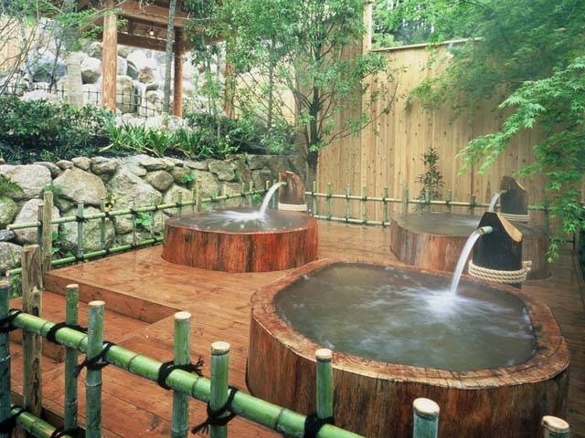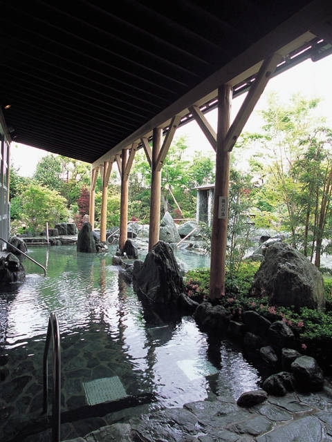 充実した設備の温泉施設。大浴場には檜風呂やサウナなどがあり、屋外には露天風呂や打たせ湯、さらに11の貸切風呂を設けている。貸切風呂のうち六つは休憩室がつく離れ形式。