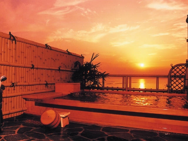 露天風呂では天然温泉に浸かりながら波の音を楽しめ、晴天時には夕日の絶景を眺めながら、心と体をリフレッシュできる。温泉はすべて源泉かけ流しで、冷え性や慢性皮膚病、疲労回復、健康増進などに効果が期待できる。また、ゆったりとくつろげる家族風呂や、介護が必要な方でも温泉を楽しめる介護用家族風呂もある。