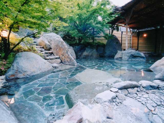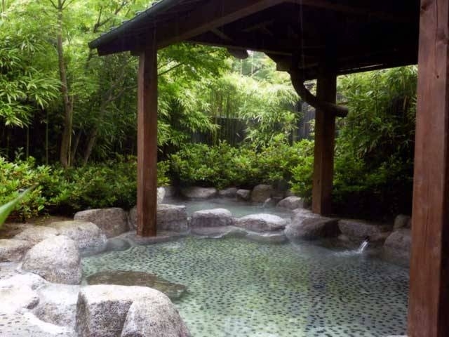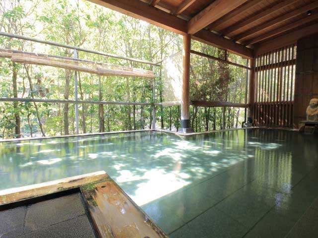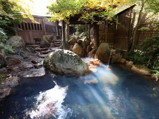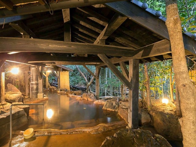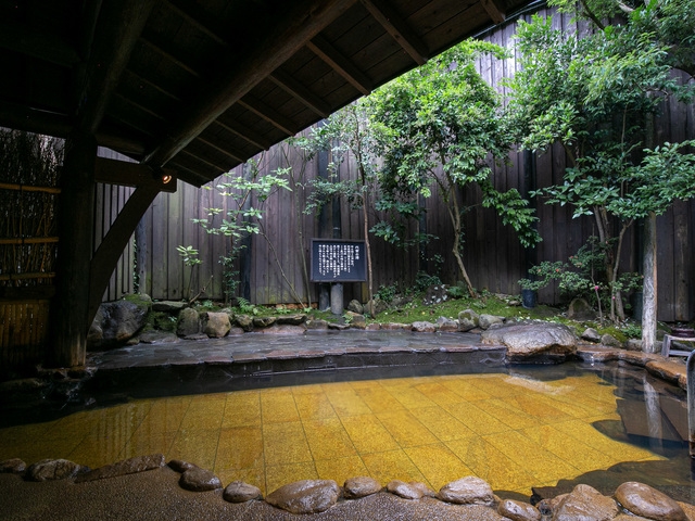 嬉野川沿いに建つ和風旅館。内風呂と露天風呂、貸切露天風呂があり、名物の茶をひたした露天茶風呂は人気がある。大浴場は小庭に設けられていて、四季の移ろいを楽しみながら入浴することができる。